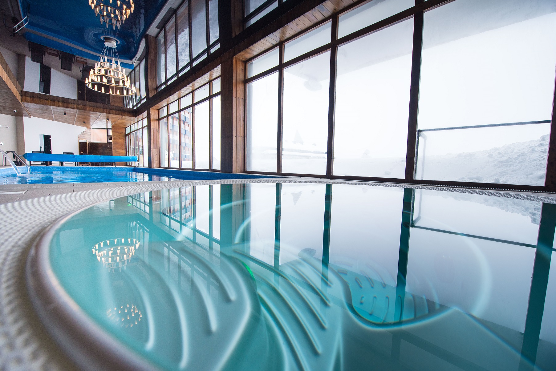 The serene pool at Go Gudauri Spa resort boasts sleek décor that features striking floor-to-ceiling teak columns set against a cool white tile floor. Poolside dining is also available, featuring a selection of dishes from any cuisine you desire that are both healthy and delicious.